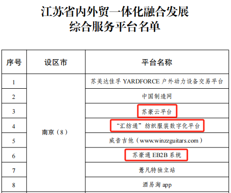 近日,江苏省商务厅公布内外贸一体化融合发展综合服务平台名单,苏豪控股集团旗下“苏豪云”平台、“汇纺通”纺织服装数字化平台和“苏豪通EB2B系统”三大自主研发平台成功入选,彰显了集团数字化转型和内外贸融合发展的成果。