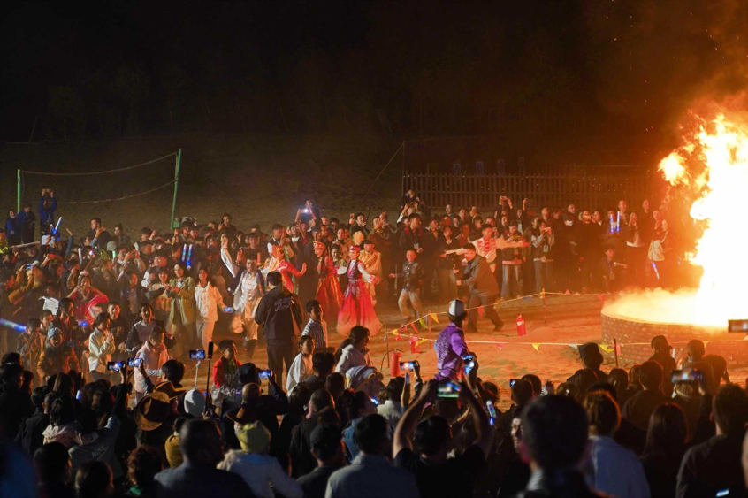 夜幕四合,音浪澎湃。现场观众的热情愈发炽烈。回溯活动全程,多元演艺阵容持续为沙海注入活力:首日,依明尼亚孜·于苏英、王译琳相继登台,以特色表演铺展沪莎文化交融的艺术长卷,莎车县十二木卡姆歌舞团、叶城县歌舞团联袂演出,展现出浓郁的风情;次日,氛围随之一转,专业电音团队带来了一场震撼视听的潮流盛宴,用强劲节奏点燃了沙海的璀璨夜色;最后一日,演出阵容再度升级,CORSAK胡梦周、触大喜乐队、王洋及阿布都艾尼·牙森轮番登场,多元曲风在沙海之上交织共鸣,间奏和鸣与大地同呼吸。