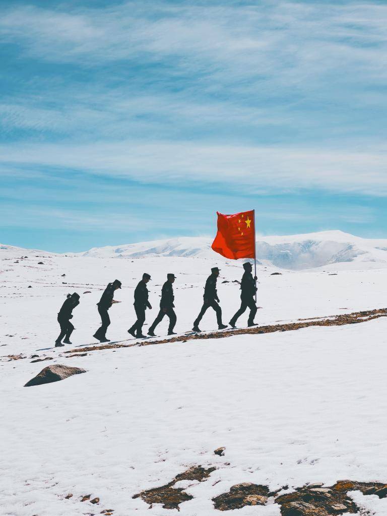 r海拔5600米,在岗布冰川的注视下,鲜红的五星红旗和移动的藏蓝身影,成为天地间最醒目的色彩。他们攀上冰碛垄,踏查边境情况,不放过任何一丝异常。