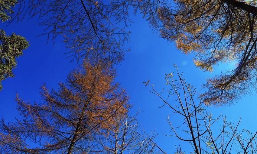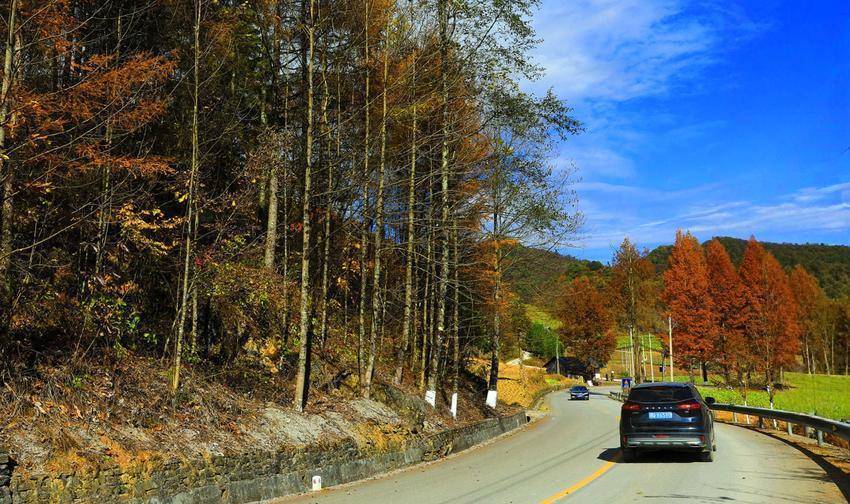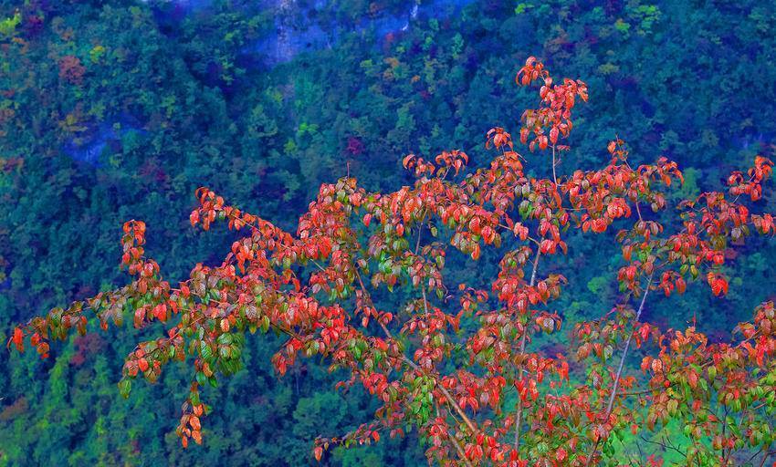 蓝天下的水杉树那细碎的针叶,穆籽树的小阔叶,似接天的红浪,又像天边燃烧的火烧云,更如漫山怒放的红杜鹃,热烈而奔放,将整个世界都染成了绚烂的红色。
